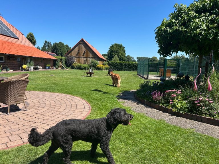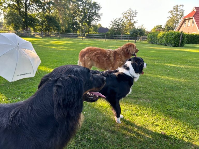 Unkontrollierte und wilde Spiele, sowie das Jagen von Dingen, finden bei uns nicht statt, um Objektstreit und Verletzungen zu vermeiden. Die maximale Sicherheit unserer Gasthunde steht an erster Stelle.